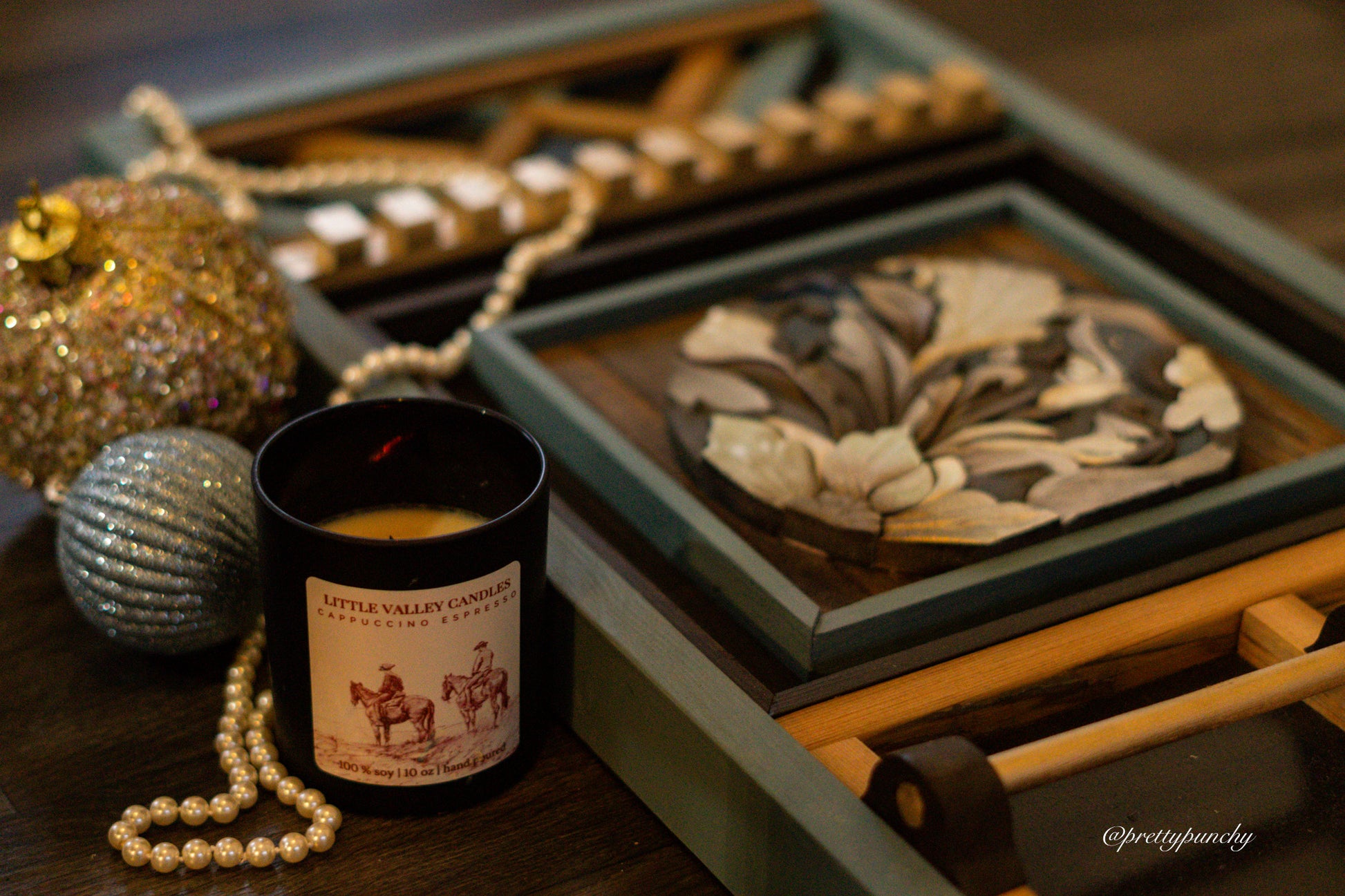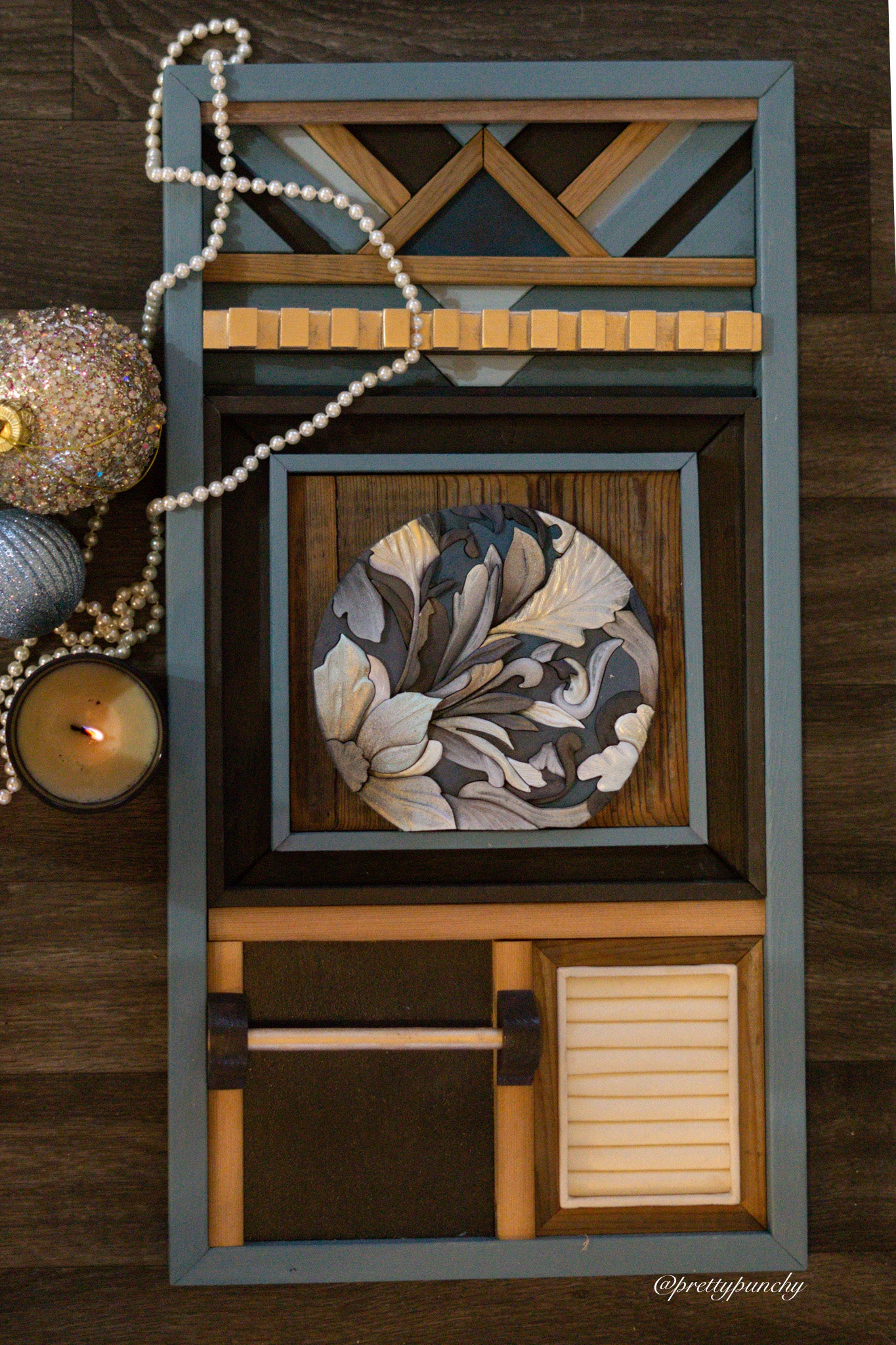 This jewelry holder is loaded with style. Those blues, golds, and whites really grab attention. Each piece of the floral has been hand cut, shaped, and painted.