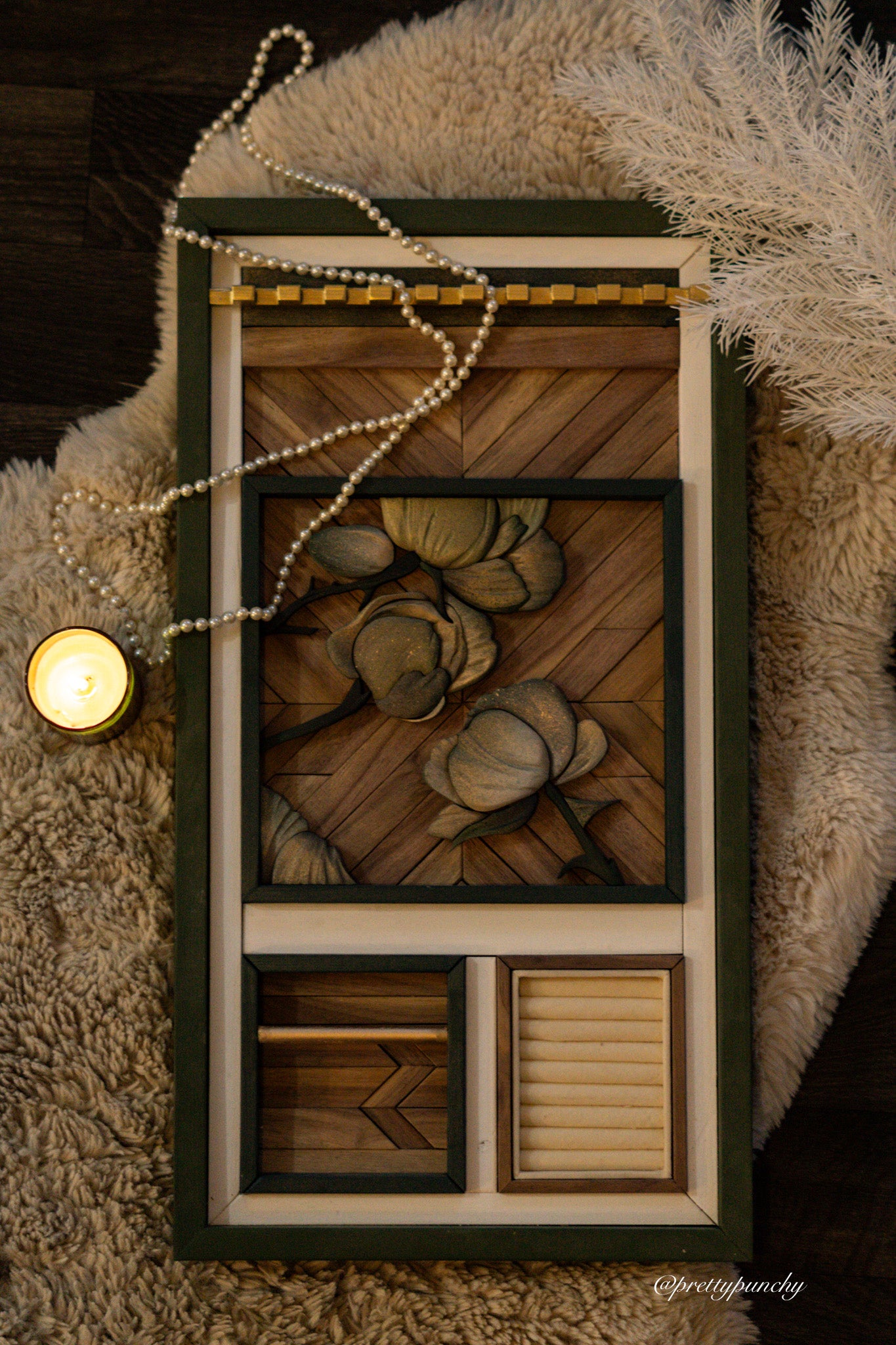 This piece includes a necklace holder, ring holder, and stabilized bracelet holder.