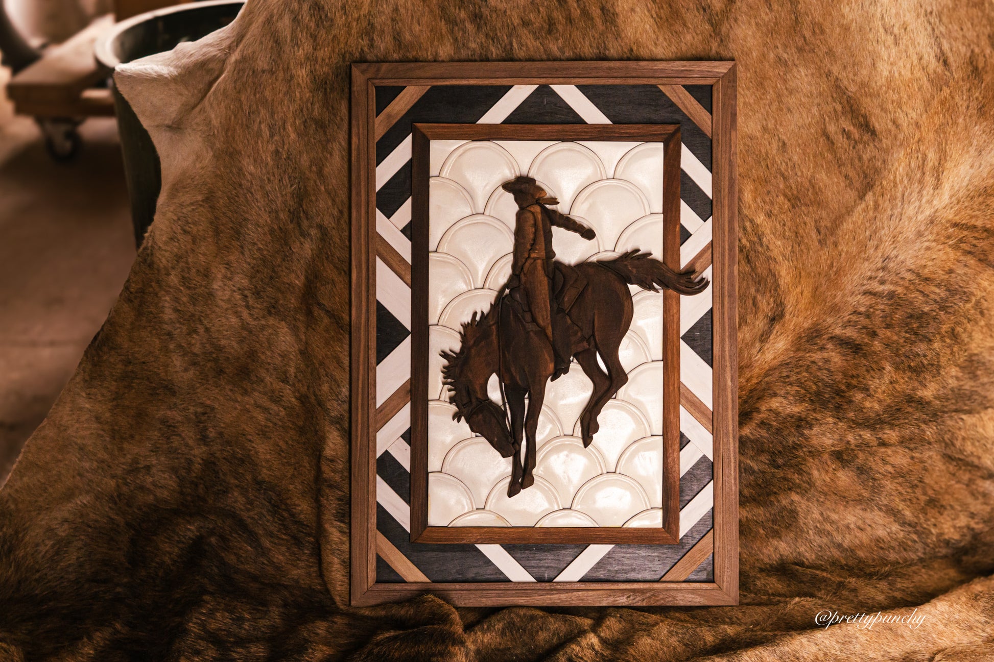 This bronc has been hand carved from walnut and placed on a shell inspired hand carved backer.